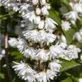 Die weißen, gefüllten Blüten des Gefüllten Sternchenstrauch 'Plena' erscheinen in Rispen von Juni bis Juli. Diese werden etwa 1 - 2 cm groß.