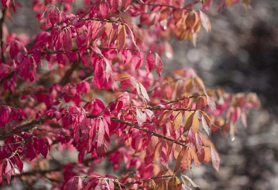 Besonders dekorativ sind die orange-roten Früchte von Euonymus alatus. Diese erscheinen ab Anfang September.
