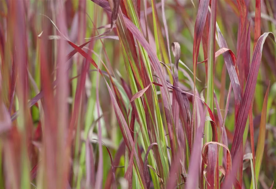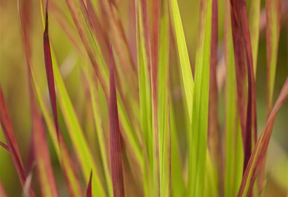 Die sommergrünen Blätter des Garten-Blutgrases 'Red Baron' sind grün-rot, lineal. Garten-Blutgras 'Red Baron' zeigt sich leuchtend rot im Herbst.
