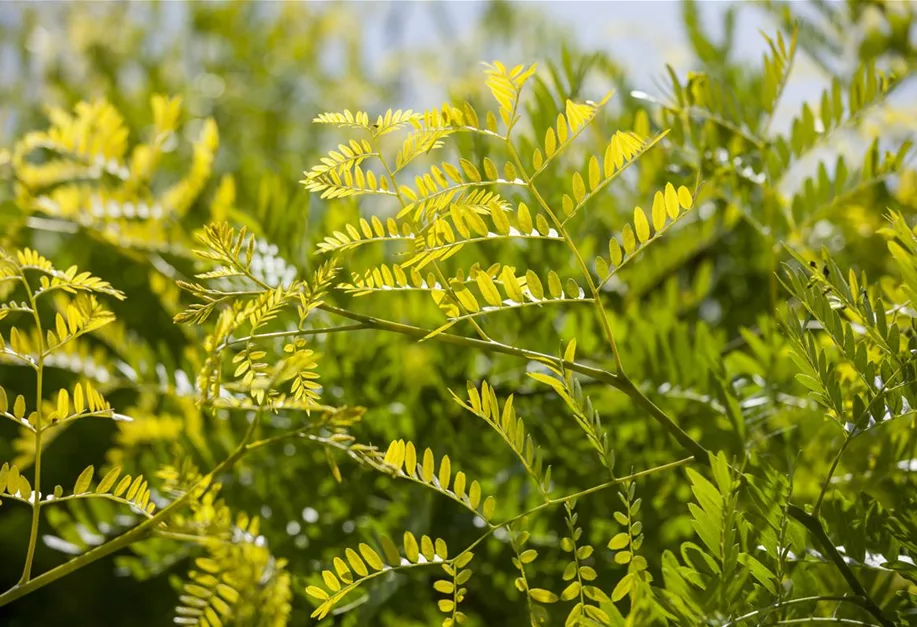 Die sommergrünen Blätter des Lederhülsenbaums 'Sunburst' sind hellgrün, gefiedert. Diese sind etwa 3 - 4 cm groß. Goldgelber Austrieb. Lederhülsenbaum 'Sunburst' zeigt sich leuchtend bernsteingelb im Herbst.