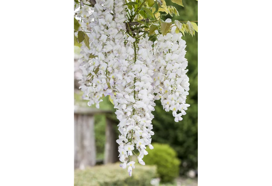 Die weißen Blüten des Weißen Blauregen erscheinen in Trauben von Ende Mai bis Juni. Diese sind angenehm duftend.