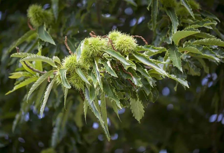 Castanea sativa 'Lyon' bildet braune Früchte mit einem mehligen Geschmack. Die Fruchtschale ist stachelig. Reifezeit ab Oktober.