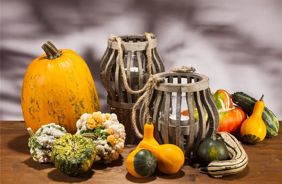 Kürbisse gehören sowieso zum Repertoire, wenn man an Herbst-Deko denkt. In Farben und Formen sind sie so vielfältig, dass für jeden etwas dabei ist. Außerdem kann man die Arten so wunderbar miteinander kombinieren. Von groß bis klein und von leuchtend orange bis dezent grün kann alles neben- und sogar mal übereinander stehen. Auf der Eingangstreppe fantasievoll aufgestellt, sorgen sie für gute Laune, sobald man nach Hause kommt. Auch Gäste mögen es, wenn sie jahreszeitengemäß und kreativ zugleich begrüßt werden. Wer es besonders heimelig mag, stellt noch eine rustikale alte Laterne dazu. Vielleicht noch ein paar Kastanien, frisch aus der stacheligen Umhüllung gesprungen, zur Lichtquelle drapieren?